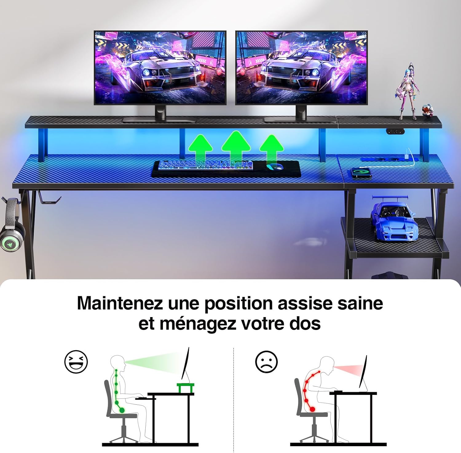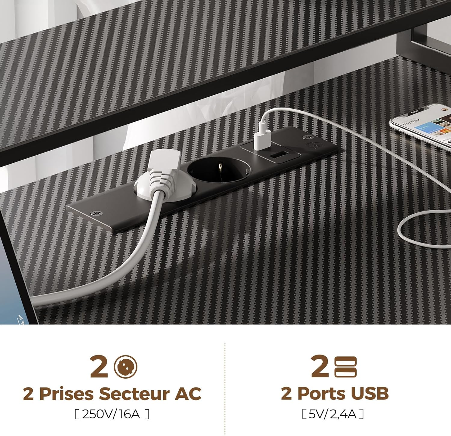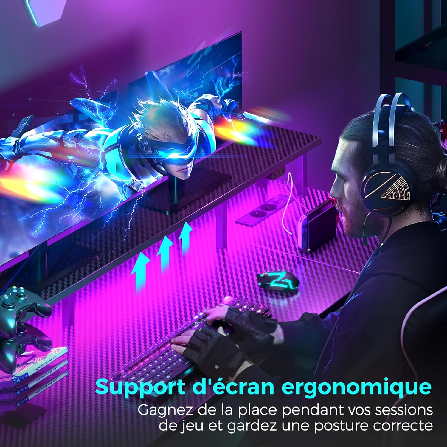 Bureau Gaming Seven Warrior – Grand Bureau 160 cm avec Éclairage LED RGB, Multiprise Intégrée, Support Casque & Gobelet – Plateau Carbone Style Moderne