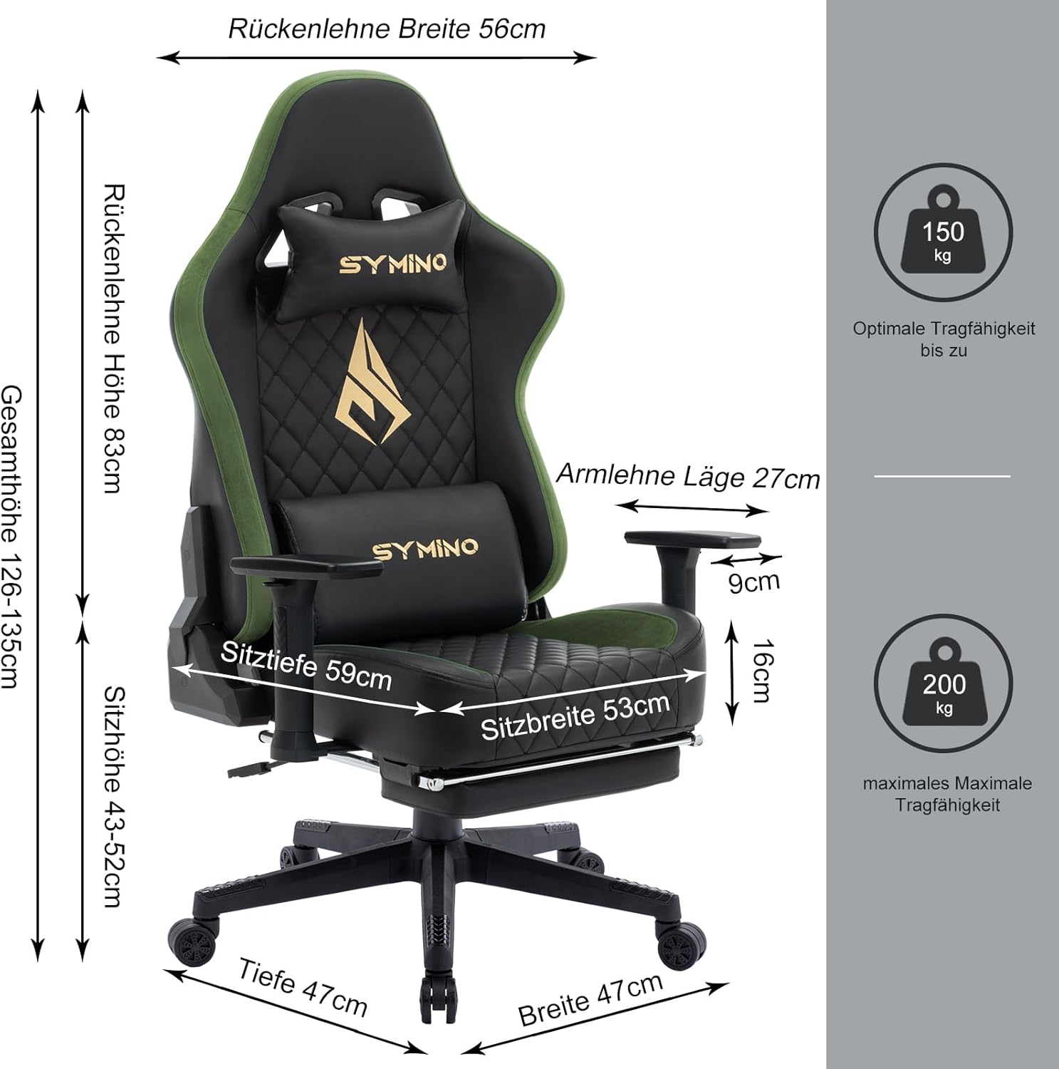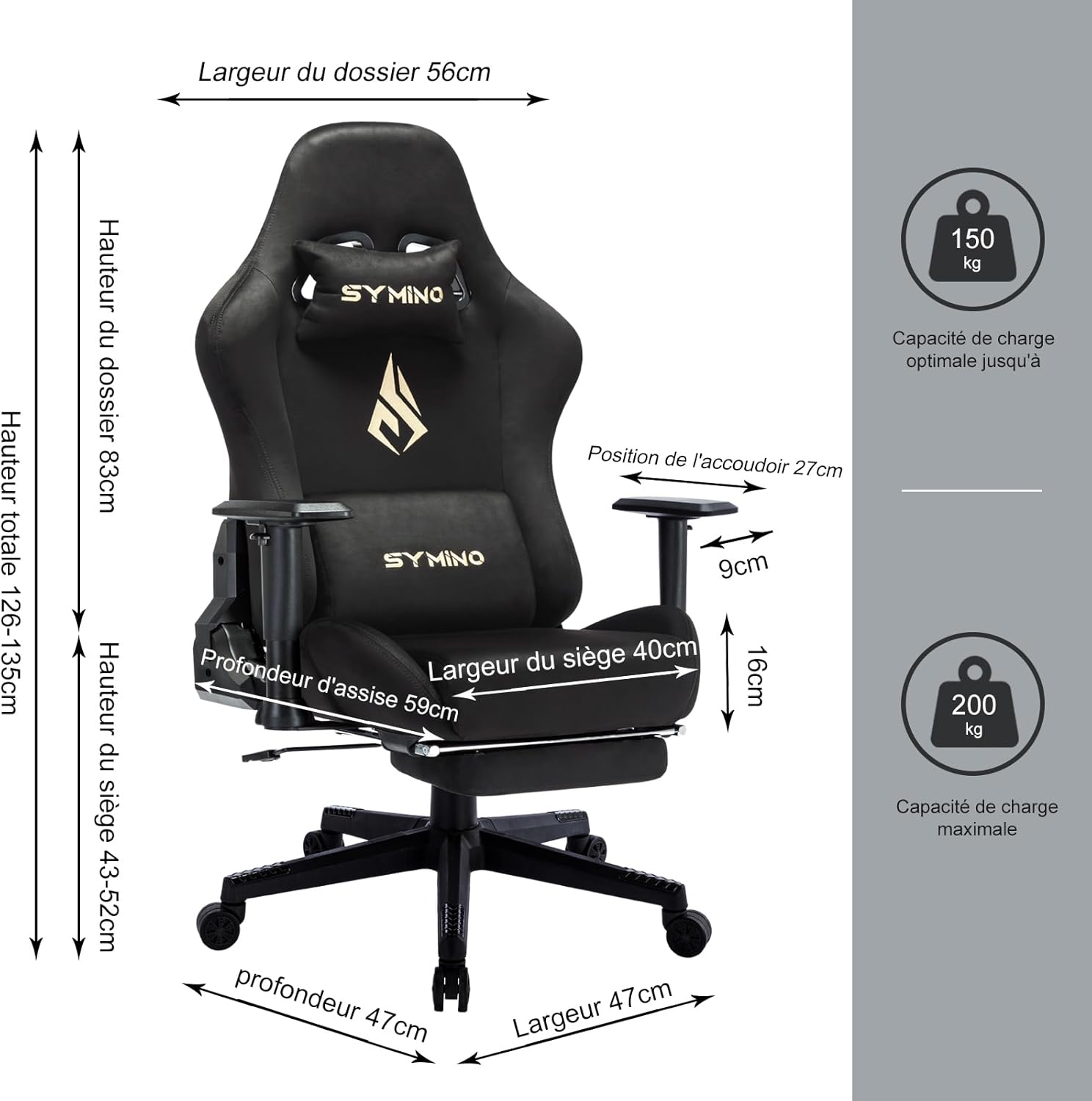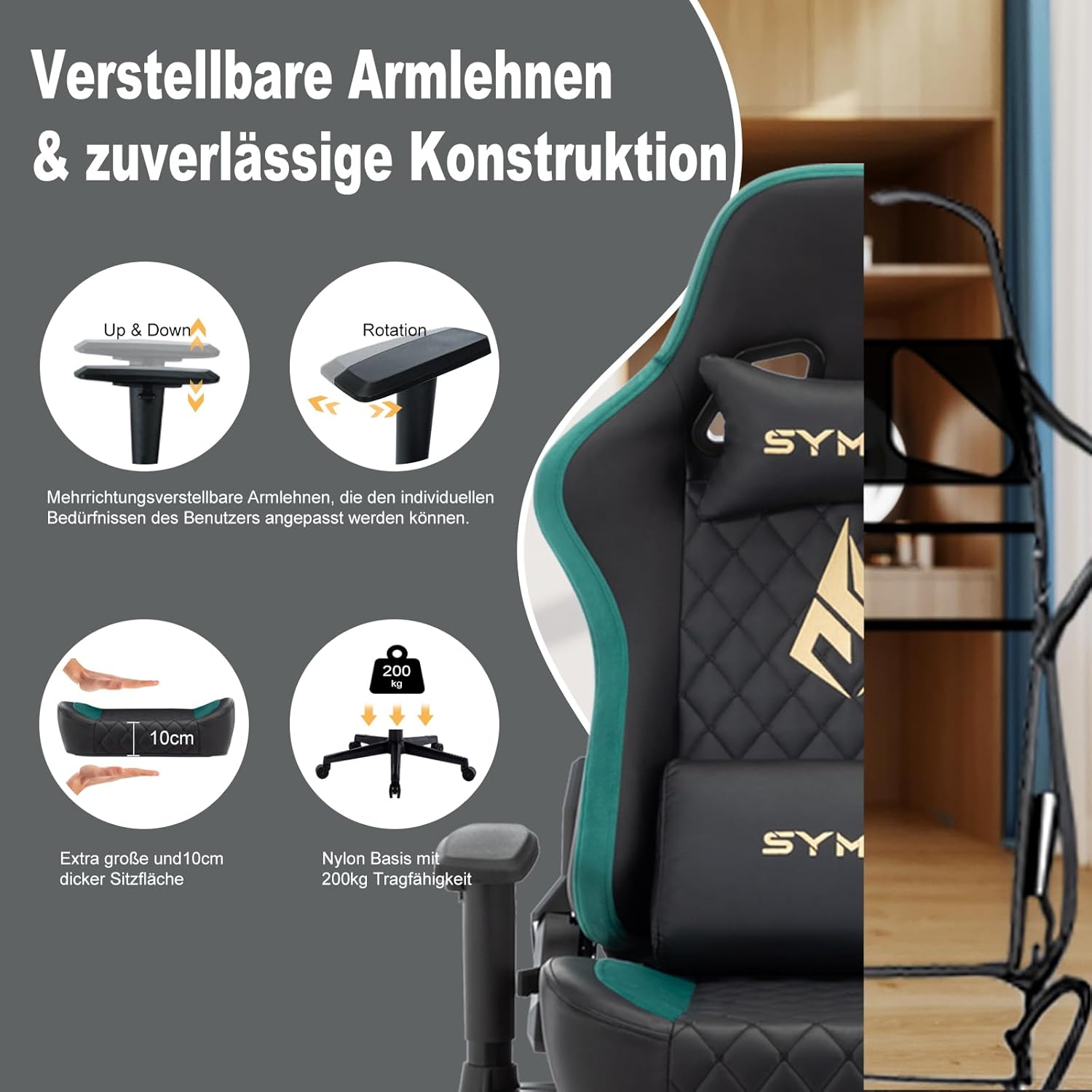 Chaise Gaming Symino – Ergonomique avec Repose-Pieds, Dossier Inclinable, Accoudoirs Ajustables, Cuir PU, Coussin Lombaire & Têtière